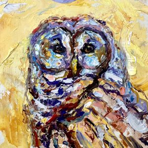 Volkmann Judy Barred Owl 2023 oil on cradled wood panel 4x4x1.5in