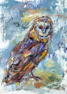 Volkmann Judy Wishing Well Barn Owl 2023 oil on cradled wood panel 7x5x1.5in