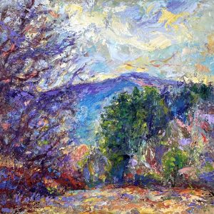 Volkmann Judy Mountain View from Westons Beach, Fryeburg, ME 2025, oil on board 6x6in