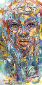 Volkmann Judy Walking Buddha 2026 acrylic, ink and oil on canvas 20x10x1.5in 6 February 2026Judy Volkmann