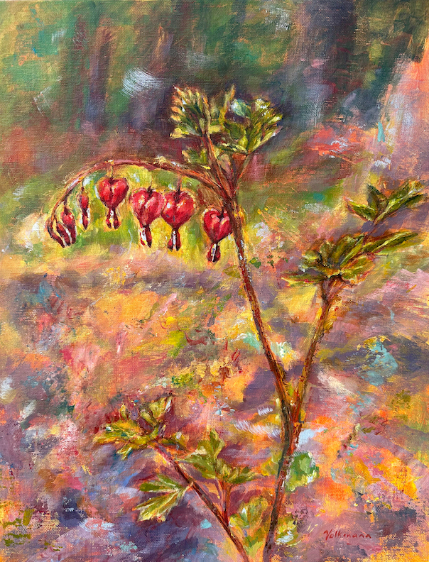 ©Judy Volkmann, Bleeding Hearts, 2025, acrylic on canvas board, 18 x 14 in, framed, $750 Available at Boothbay Region Art Foundation in Boothbay Harbor, ME