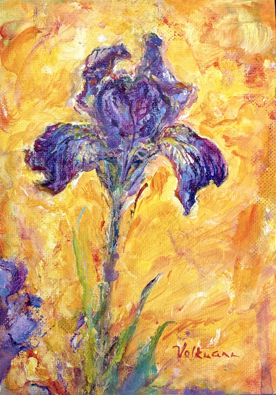 ©Judy Volkmann, Iris, 2025, acrylic on canvas board, 5 x 7 in, framed, $300 Available at Boothbay Region Art Foundation in Boothbay Harbor, ME