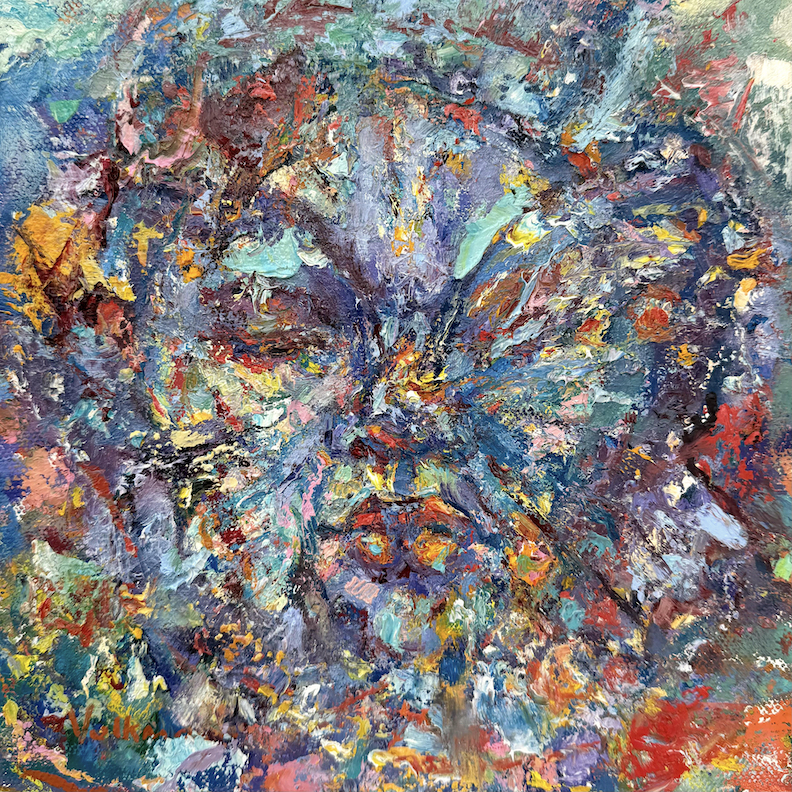 ©Judy Volkmann, Cosmo, 2024, oil on board, 6 x 6 x 1/8 in, framed, $250 Available